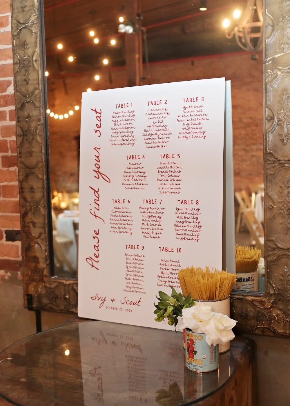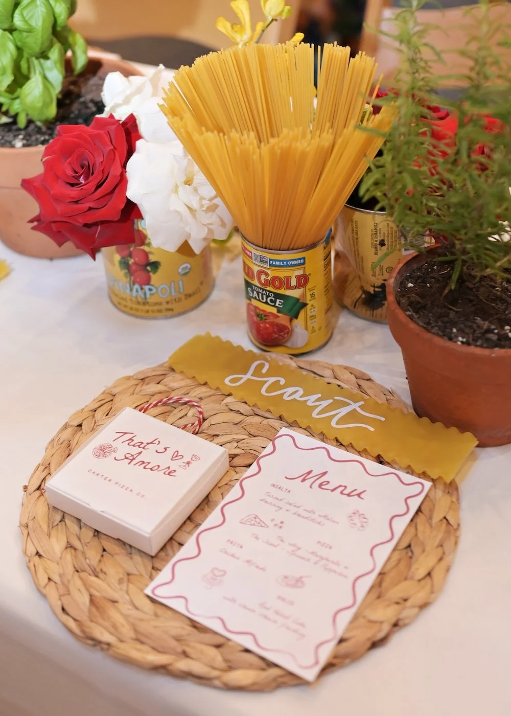 A large seating chart display that matched the welcome sign directed guests to their tables where rattan chargers held personalized place cards. Each place card was a dry lasagna noodle calligraphed with each rehearsal dinner guest’s name - how fun and unique! Along with their place cards, each place setting had a pizza dinner menu card and a tiny pizza box favor.