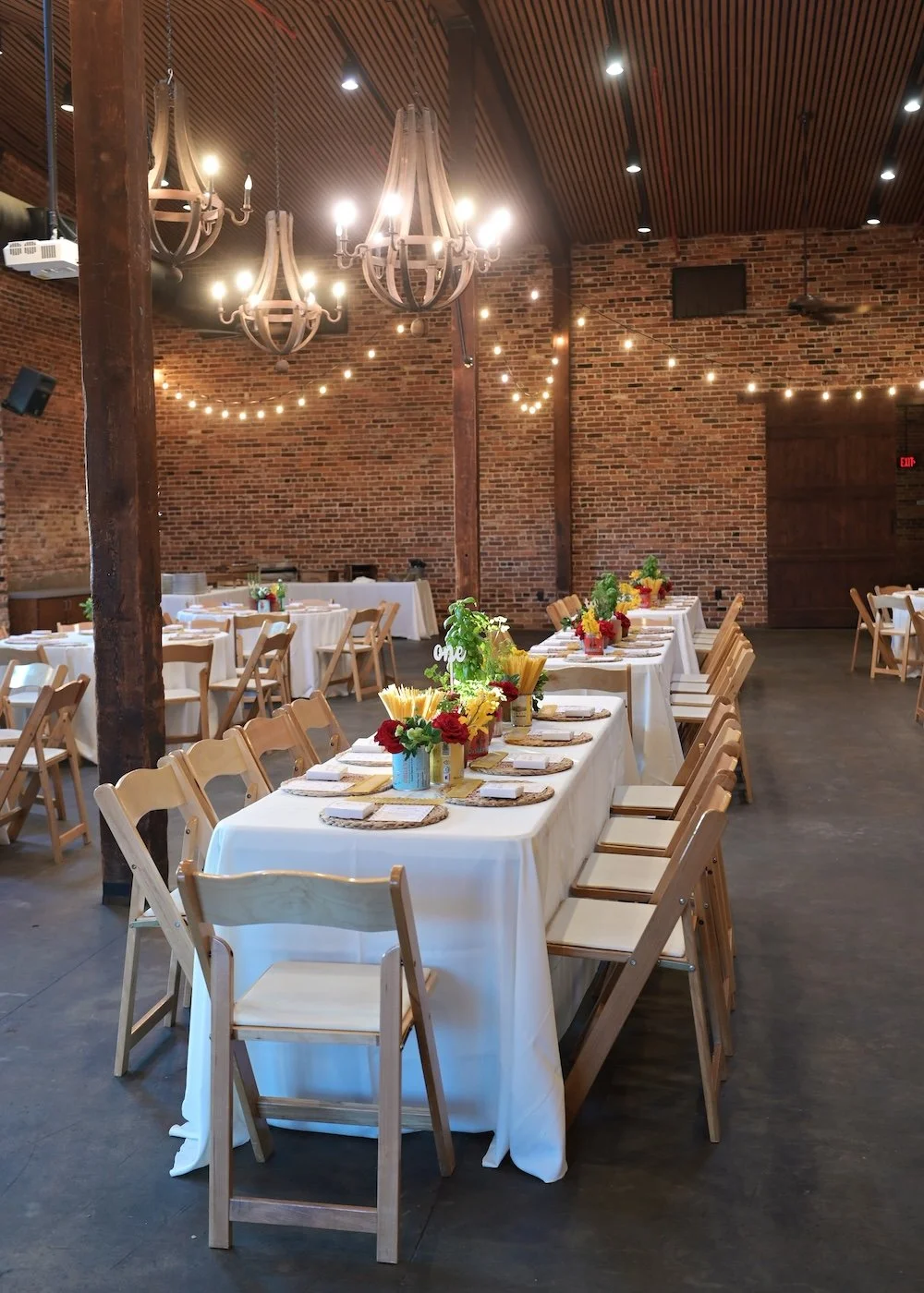 Right off the bat, guests were welcomed to this Italian inspired wedding rehearsal dinner with an “That’s Amore” welcome sign featuring a pizza and wine drawing. Inside the rustic event ballroom, white tablecloths, hanging twinkle lights and chandeliers, and exposed brick walls reminds of classic old-school Italian restaurants. Fresh herbs like parsley, basil, and rosemary in terracotta pots were mixed with red and white roses for a vibrant centerpiece design in the classic Italian flag colors. Pasta sauce cans and crushed tomato cans served as vases for the roses in the centerpieces for a vintage inspired design. The long tables also had cans of dried pasta mixed in for an edible and sustainable element to the centerpieces.