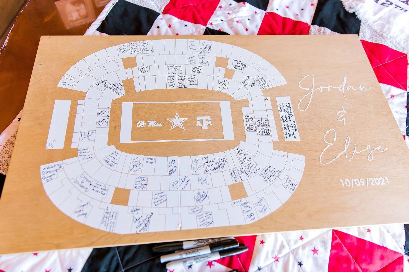 Personalization goes a long way too. Custom napkins, place cards, and sports themed rehearsal dinner signs can tie everything together effortlessly. There are endless sports fonts and colors to choose from when designing your signage and picking your palette.