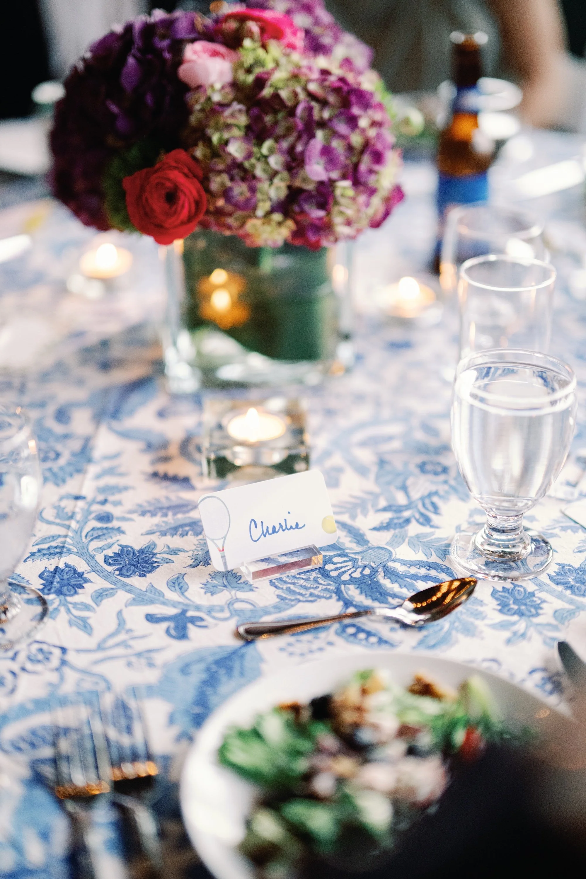 “The easiest way to pull a palette together is through stationery, rather than trying to redo full wedding-level florals,” explains Craig Peterman, Photographer at Craig Peterman Photography. “Let the table do the work with glassware, plating, and menus. Maybe a signature drink that matches the tone. Since the rehearsal is usually in a restaurant or smaller space, a few small touches in the right colors are enough to make it feel designed without going overboard.”